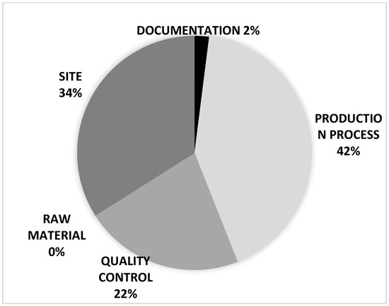 Percentage distribution of registered non-conformities along the entire production process steps.