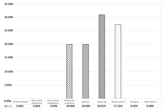 The results of the analysis also show that production is the most critical phase of the process (asepsis and radioactivity). In particular, the dispensing phase has proven to be the most critical, implying a delay or even a loss of production along with customer dissatisfaction. In addition, there are problems during the dispensing phase; as an example, the breakage of a product vial could result in personal and environmental contamination and put an operator’s safety in danger (Table 2).