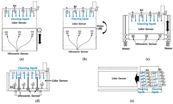 The performance of vehicles is improving by combining various technologies. In the past, driving performance was the most important factor when judging a vehicle; nowadays, driving convenience options are important to customers [1,2,3]. Accordingly, automakers are developing various convenience options and technologies to increase vehicle sales. Autonomous driving is one of the options offering convenience that reduces driver fatigue. Thus, automakers have applied autonomous-driving technology to various vehicles. However, consumer complaints regarding frequent malfunctions of autonomous-driving sensors are increasing; these malfunctions often result in accidents. Various factors cause autonomous-driving malfunctions and accidents with the pollution of autonomous-driving sensors (Lidar, radar, cameras, ultrasonic sensors, etc.) contributing the most. Since the autonomous-driving sensor is exposed to the external environment, various pollutants (snow, ice, dead insects, dust, mud, etc.) deposit on the sensor surface, causing autonomous-driving malfunctions. Various studies have focused on eliminating this pollution. Won and Kang developed an algorithm that can determine the surface pollution of Lidar sensors in real time during vehicle operation and improve autonomous-driving accuracy by filtering pollution [4]. Ryu and Lee installed a sound wave generator on the back of the sensor glass and studied self-cleaning by removing pollutants using sound waves and vibration [5]. Kim et al. investigated the removal of fog, frost, snow, and water droplets by installing heating electrodes on autonomous-driving camera lenses [6]. Son et al. studied how various characteristics of pollutants such as blockage type, concentration, additives, and dryness affect blockage [7]. Figure 1 shows patents related to the cleaning of the autonomous-driving sensor [8,9,10,11,12]. Figure 1a–d show vehicle Lidar sensor-cleaning devices of the sliding, folding, up–down, and ultrasonic vibration wiper types, respectively, whereas Figure 1e shows the Lidar sensor-cleaning device. The common operating mechanism sequence of Figure 1a–d is largely divided into three steps. In the first step, cleaning liquid is sprayed through a cleaning nozzle installed at the top or side to initially remove pollutants attached to the sensor surface. In the second step, the ultrasonic sensor slides or folds to cover the autonomous-driving sensor and then generates ultrasonic vibration to remove pollutants from the sensor surface. The differences in the operation of ultrasonic sensors in Figure 1a–d are as follows. Figure 1a operates the ultrasonic sensor cover in the up and down direction through a gear attached to the side. Figure 1b folds up or down the ultrasonic sensor using an electric motor. Figure 1c moves the ultrasonic sensor in the up and down direction using electric motors on both sides. In Figure 1d, the ultrasonic sensor moves up and down through the lever attached to the side. In the third step, air is sprayed from an air nozzle to blow away pollutants and cleaning liquid from the surface of the autonomous-driving sensor and dry it. In Figure 1e, the cleaning liquid and air nozzles are arranged sequentially, and the surface of the autonomous-driving sensor is cleaned using a cleaning liquid and then dried with air.