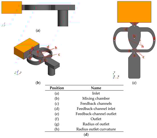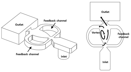 The performance of the nozzle in cleaning autonomous-drive sensors is largely divided into two categories: sweeping angle and frequency. The sweeping angle indicates the spraying operating angle. The larger the sweeping angle, the wider the range of pollutants that can be removed. With the increase in frequency of the fluidic oscillator, there is an advantage of reduced flow rate. Therefore, the nozzle-performance development was mainly performed from this perspective, and in developing the model representing the new performance, we referred to studies that analyzed the nozzle flow characteristics [7,8,9,10,11,12,13,14,15]. Figure 3 shows the base model of the nozzle selected in this study to clean autonomous-driving sensors.