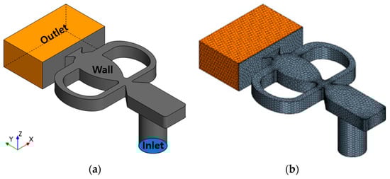 The nozzle for cleaning autonomous-driving sensors used in this study was in an unsteady state in which crossflow occurred due to turbulence, and the continuity equation, momentum equation, and standard k-ω turbulence model were used. The fluid applied in the analysis was assumed to be washer fluid and single-phase flow. Figure 5a shows the boundary conditions of the nozzle for cleaning autonomous-driving sensors. The place marked with a blue circle is the inlet, the five sides marked with orange represent the outlet, and all other grays were walled. The inside of the nozzle was assumed to be atmospheric pressure as an initial condition. In the case of boundary conditions, the inlet specified the pump condition in the base model, 1.5 to 5 bar range and applied at 0.5 bar intervals. The outlet was applied at atmospheric pressure. The computational grid for calculating the flow area was created using the mesher function in STAR-CCM+ Ver.11.04 [25]. Polyhedral was applied to the grid type, and the base size is 0.2 mm. Prism layer mesh was applied to accurately calculate the rotational flow near the wall. Prism layer mesh is advantageous for calculating the rotational flow of fluid because a thin grating is created on the wall. The Wall y+ value is over 30 and is distributed at the nozzle outlet. The calculated error rate of the inlet and outlet mass flows was within 1%. The calculation grid settings are shown in Table 2, and Figure 5b shows the calculation grid creation result for the base model. The number of calculation grids ranged from 66,000 to 73,000 depending on each model.