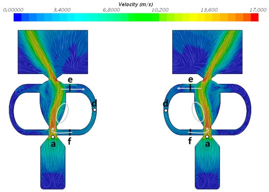 In the nozzle for cleaning autonomous-drive sensors, the flow goes back and forth between walls periodically due to the Coanda effect. Part of the main flow moves to the feedback-channel inlet ((d) in Figure 6). As the fluid flows inside the channel, the pressure increases, affecting the flow in the inlet area ((a) in Figure 6). The flow entering the feedback channel inlet ((d) in Figure 6) is released at outlet((f) in Figure 6) meets the main flow and forms a vortex, forming a reaction force and causing oscillations (gray circle in Figure 6). The flow meets the main flow and forms a vortex, forming a reaction force and causing oscillations (gray circle in Figure 6). If this flow pattern occurs periodically, a sweeping angle and frequency are formed. The sweeping angle was measured from when the crossflow stabilized. For frequency, the difference in total pressure and static pressure between the feedback-channel inlet ((d) in Figure 6) and the feedback-channel outlet ((e) in Figure 6) was calculated to determine the change in dynamic pressure, and the period was measured using the time difference. All internal flow patterns in this study were similar to the one shown in Figure 6.