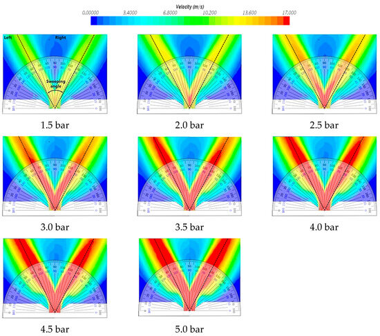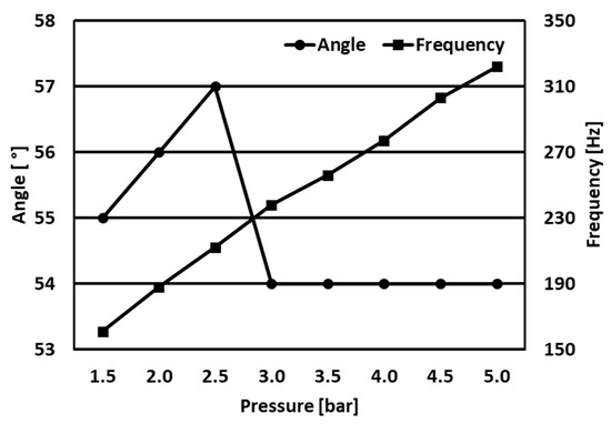 In the base model, we confirmed how pressure conditions affect the sweeping angle and frequency. As a result of the analysis, it was observed that the frequency increased with the increase in inlet pressure. As the pressure inside the nozzle increases, the inlet fluid speed increases. When the fluid inlet speed increases, the pressure decreases according to Bernoulli’s theorem and flows into the feedback-channel inlet at a high speed. As the pressure inside the nozzle increases, the crossflow in the feedback channel proceeds faster and the frequency increases. The sweeping angle and frequency for each variable are shown in Table 3. To measure the sweeping angle, the velocity distribution according to the change in inlet pressure was measured as shown in Figure 7. As the nozzle internal pressure increases, there is little change in angle, but the frequency increases (Figure 8). In the base model, the frequency doubled as the inlet pressure increased from 1.5 to 5.0 bar. When the inlet pressure is 2.5 bar or less, the sweeping angle tends to increase. However, for 3 bar or more, the sweeping angle is fixed at 54°. However, the pressure variation has a minor effect on the sweeping angle. The inlet pressure is considered a major factor affecting the frequency.