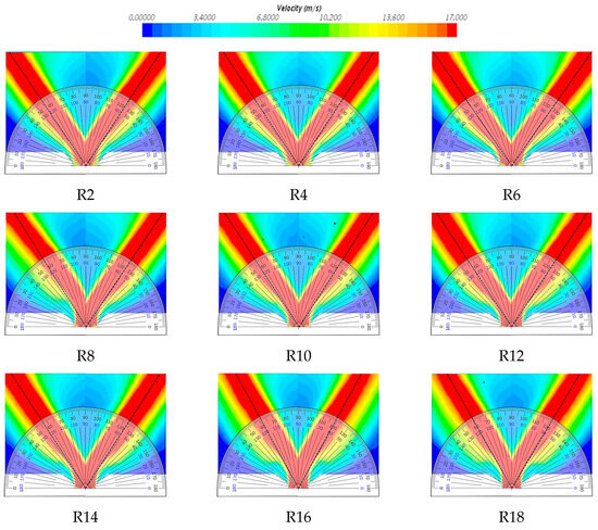 Analysis of the main variable, radius of outlet, was performed based on the pressure condition of 5.0 bar, which showed the highest frequency in the base model. Table 4 shows the sweeping angle and frequency for each design variable model. The result of the analysis showed that the sweeping angle increased as the radius of the outlet decreased. This means that as the outlet area increases, the outlet velocity decreases compared to the base model, and the outlet pressure increases according to Bernoulli’s theorem. Therefore, an increase in the outlet pressure causes the sweeping angle to increase because it increases the amount of inflow flowing into the feedback-channel inlet. Figure 9 shows the speed distribution used to measure the sweeping angle of the autonomous-driving sensor-cleaning nozzle. It was observed that the frequency was constant despite changes in the radius of outlet. Figure 10 shows the comparison of the sweeping angle and frequency for each model. As the outlet area increases, the sweeping angle decreases, and the frequency tends to increase. The highest sweeping angle is 70° for R6, and the highest frequency is 333 Hz for R8. Therefore, it was difficult to analyze the effect because the frequency performance improvement of the radius of outlet models compared to that of the base model was less than 3%. Excellent performance improvement was obtained at an approximately 30% increase in the sweeping angle of the R6 model. It is believed that the radius variable in these outlets has a major effect on the sweeping angle.
