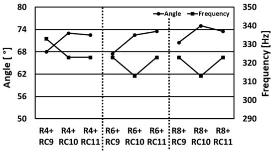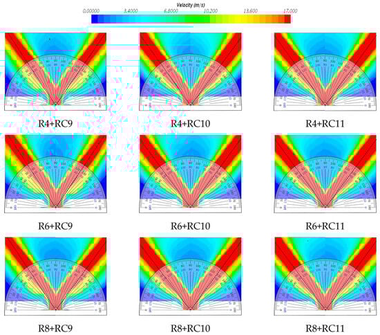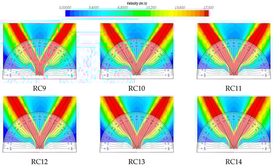 The analysis of the main variables revealed that the models with the most increased sweeping angles were the R4 and R6 models of the radius of outlet and the RC9, RC10, and RC11 models of the radius of outlet curvature. Therefore, additional analysis was conducted by combining the two design variable models. The analysis was based on the pressure condition of 5.0 bar, which had the best frequency performance in the base model, and the sweeping angle and frequency of the analysis results for each model are shown in Table 6. Results show that the sweeping angle increased in the model with two design variables compared to the model with one. This further improved performance by increasing the amount of inflow into the feedback channel through the two variables, radius of outlet and radius of outlet curvature. The sweeping angle and frequency for each variable are shown in Table 6. The velocity distribution used to measure the sweeping angle for each model is shown in Figure 13. Figure 14 shows that the sweeping angle of the model with two design variables was larger than that of the model with one design variable. The highest sweeping angle was 75° for R8+RC10, and the frequency was almost constant. Compared to the base model, the sweeping angle of R8+RC10 showed excellent performance improvement with an increase rate of 39%. It is believed that the radius variable in this outlet curvature has an excellent effect on sweeping angle change.