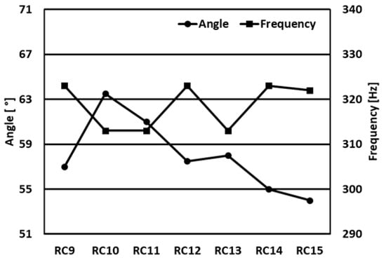 Based on the pressure condition of 5.0 bar in the base model, the main variable radius of outlet curvature was analyzed as a design variable. Table 5 shows the sweeping angle and frequency results for each model. The sweeping angles for each radius of outlet curvature model were compared. It was found that as the radius of outlet curvature decreased, the flow rate at the outlet increased and the sweeping angle rapidly increased. This is because as the flow rate increases, the flow coming out of the feedback-channel outlet meets the main flow and generates more vortices than those of the base model. Due to these vortices, the reaction force pushing the main flow in the opposite direction increases, causing the sweeping angle to increase. Additionally, when the flow resistance pushes in the opposite direction, the flow is sprayed along the outlet wall due to the Coanda effect, which affects the increase in the sweeping angle. Therefore, the increase in the radius of outlet curvature has a major effect on the sweeping angle. As a result, the frequency was over 313 Hz. Figure 11 shows the sweeping-angle measurements. As the radius of outlet curvature increases, the sweeping angle decreases and the frequency increases. The sweeping angle and frequency for each model are compared in Figure 12. The highest sweeping angle was 63.5° in RC10, and the frequency was almost constant. Therefore, as the radius variable at the outlet decreases, the sweeping angle tends to increase. Compared to the base model, the sweeping angle of RC10 increased by 15%, showing excellent performance improvement. It is believed that the radius variable in this outlet curvature has a major effect on the sweeping angle.