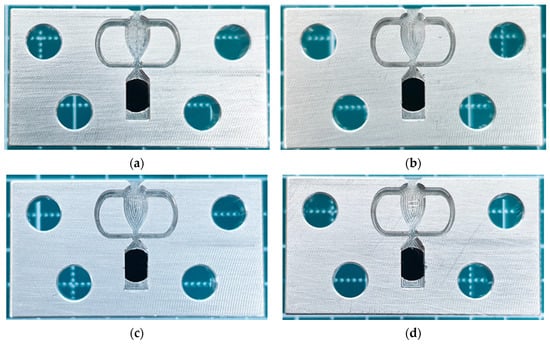 The three models with the best sweeping angles for each design variable and the base model were selected and tested. The models with the best sweeping angles are R4+RC10, R6+RC11, and R8+RC10. Therefore, three models and the base model were produced in aluminum. The produced models are shown in Figure 15. The experimental device is shown in Figure 16a, and the experiment was performed under a pressure of 5 bar. The experimental device is shown in Figure 16b.