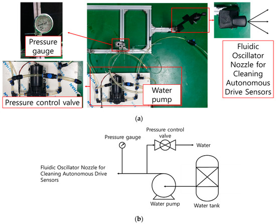 When cleaning autonomous-driving sensors, nozzle performance is important because the sprayed cleaning solution physically cleans pollutants. In this study, the flow characteristics of the nozzle were studied to improve the cleaning performance of the nozzle in cleaning the autonomous-driving sensor. Currently, windshield-washer nozzles are used for cleaning autonomous-driving sensors, and few studies focused on nozzles for cleaning autonomous-driving sensors. Because the nozzle size is small, the error rate during precision machining is high, and the nozzle is sensitive to even minute changes in size. In this study, a fluidic oscillator nozzle shown in Figure 2 was used to remove pollutants adhering to the surface of the autonomous-driving sensor during autonomous driving. Figure 2 shows a patent for “apparatus for oscillating fluid injection” developed in our prior research. It has the advantage of widening the fluid injection direction and injection angle without a special device; thus, it was selected for this study. To study the nozzle for cleaning autonomous-drive sensors, we referred to studies on fluidic oscillators, which have the same internal structure [13,14,15].