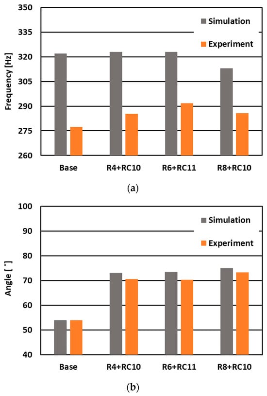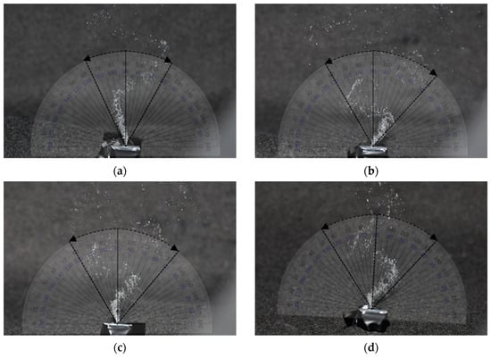 The spray experiment was conducted five times, and the average was calculated excluding the maximum and minimum values. An image of the experiment results is shown in Figure 17. In Figure 17, the sweeping angle was measured using a protractor and arrows. The average sweeping angle measured through the experiment is as follows. The base model was measured at 54°, R4+RC10 was measured at 70.6°, R6+RC11 was measured at 70.3°, and R8+RC10 was measured at 73.3°. When comparing spray angles by model, the R8+RC10 model had the widest spray angle of 73.3°. The measured sweeping angle and frequency are shown in Figure 18, and are compared with the simulation results. The comparison of the experimental and computational results shows similar results with the sweeping angle error rate being within approximately 6% and the frequency error rate being approximately 15%. This is believed to be because the design factors (radius of outlet and radius curvature of outlet) were manufactured differently from the design values due to the surface treatment and processing errors when manufacturing the prototype nozzles. Therefore, when manufacturing nozzles, the sweeping angle and frequency may differ from those of the computational models due to slight manufacturing errors. Therefore, autonomous-driving sensor-cleaning nozzles must be manufactured with high accuracy.