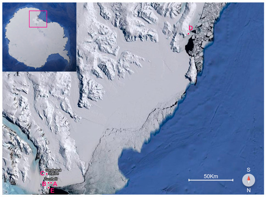 Surface snow samples were collected in the coastal area of Victoria Land (Antarctica) near Mario Zucchelli Station, one of the Italian research bases in Antarctica, located in Terra Nova Bay, along the coast of the Northern Foothills, north-east of Gerlache Inlet. The sampling coordinates are reported as follows: sample A was collected from the Icaro Camp meteorological station area (74°42′37″ S, 164°07′05″ E), sample B near Enigma Lake (74°42′38″ S, 164°01′10″ E), sample C from Browning Pass (74°36′55″ S, 163°56′29″ E), sample D near Cape Phillips (73°03′41″ S, 169°36′16″ E), and sample E from Adelie Cove (74° 45′ 40″ S 169° 36′ 16″ E) (Figure 1). All the samples were obtained during the 2020–2021 austral summer and kindly provided by the National Antarctic Research Program (PNRA) “Emerging COntaminants in Antarctic Snow: sources and TRAnsport ECO:ASTRA”. Environmental variables related to the sampling campaign have been reported in previous studies [34,35]. Snow samples were manually sampled after the removal of the uppermost superficial layer (0.3–0.8 cm) using pre-cleaned premium-grade polystyrene accuvettes to prevent contamination, with a maximum depth of 12 cm [6]. The samples were collected using both wide-mouthed glass and acid-pre-cleaned HDPE bottles (500 mL volume). All the glass bottles were rinsed twice with deionized water and dried prior to sampling. The operators wore clean-room clothes and approached the sampling areas upwind from the dominant wind direction. To prevent sample contamination, motorized activity was interrupted about 300 m from the collecting site. All the samples were frozen immediately after collection and maintained at −20 °C until analysis.