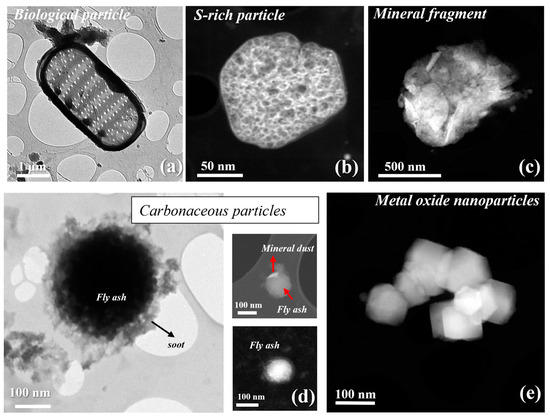 Particles of different origins were observed: based on their composition and morphology, the particles were classified as biological, mineral dust, S-rich, sea salt, carbonaceous, and metal oxide nanoparticles, with mineral dust being the most abundant class, followed by carbonaceous nanoparticles. Table 1 summarizes the types of particles, including their structural/morphological properties, size, and sampling locations. Representative TEM images of these categories are illustrated in Figure 3.