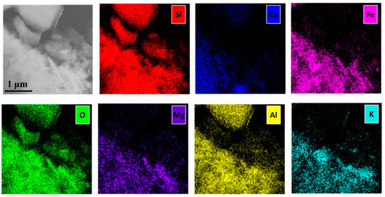 Diatoms and marine salts were predominantly identified in the samples collected near the coast (sample D), indicating a significant influence of marine aerosols on the composition of the snow. Additionally, S-rich particles were abundant in the sample closest to the coast, and their origin could be attributed to marine phytoplankton, as reported in a previous study [28]. As represented by the HAADF image and EDX maps (Figure 4), numerous mineral dust particles and aggregates, characterized by irregular shapes and sharp edges, were identified in all samples. These particles were mainly constituted by O, Na, Si, Al, Ca, P, K, Mg, and Fe, and their origins were attributed to natural geological processes, meaning they originated from the Earth’s crustal surface and were further dispersed through LRAT [6,7].