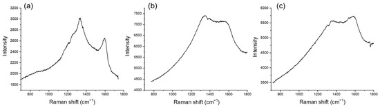Raman spectra of different small carbonaceous microparticles present in sample A: (a,b) carbon particles characterized by the D band being higher than the G band; (c) a particle with inverted band intensities.