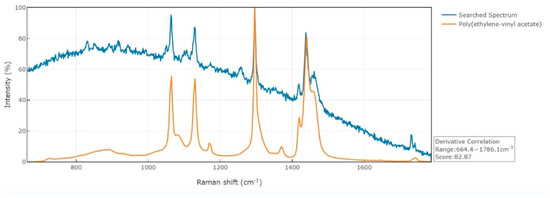 In this study, poly(ethylene-co-vinyl-acetate) (PEVA) particles having dimensions in the 15(±10)×12(±6) µm range were also observed in samples A, B, and C. An example of the Raman spectrum of PEVA is reported in Figure 9 with the characteristic bands of the polyethylene structure due to C–H stretching frequencies (around 3000 cm−1), C–H bending and twisting (1296 and 1440 cm−1), and C–C stretching (1063 and 1130 cm−1), along with the band at 1730 cm−1 marking the C=O carbonyl group of the acetate.