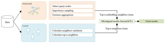 The architecture of PreferSAGE-SCF. Firstly, we created a heterogeneous graph and a user similarity matrix using the data in the dataset, and then submitted them to PreferSAGE and SCF for calculation. After that, PreferSAGE used the graph structure to calculate the embeddings of nodes’ attributes, and calculated the top n items with the highest inner product based on the target user’s historical visited items; UserCF calculates the top n nearest neighbors based on user similarity and organizes the items that they have visited before. Finally, the results of the two parts are merged using a misaligned method SCF and obtain the final results.
