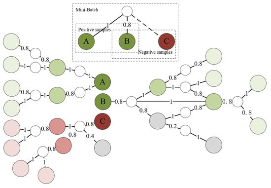 Sampling process of nodes, assuming that the number of nodes sampled in each layer is 2 and the preference weight range is from 0 to 1. White nodes represent users, green nodes represent positive sampling nodes, red nodes represent negative sampling nodes, and gray nodes represent low sampling probability nodes.