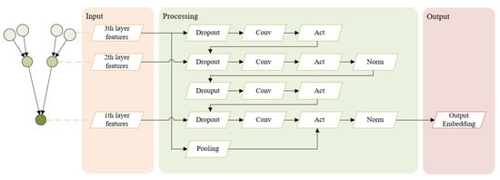 Node embedding are obtained by summing the node features embedding. The nodes embedding of the third layer go through a dropout layer and are then transformed using a fully connected layer and activated. At this point, the calculation of the third layer nodes is completed (line 1). Subsequently, the results are aggregated using an aggregation function with weights normalized by the number of hits, which is called importance pooling [9]. This method can enhance the influence of important node information during propagation. Afterwards, the aggregated result is concatenated with the nodes embedding of the second layer through a concatenate operation [33]. The operation result is transformed and activated using another fully connected layer after passing through a dropout layer (line 2), and the activated features are normalized (line 3) to obtain the nodes embedding of the second layer. The information propagation process from the second-layer nodes to the first-layer nodes is similar to before, but the difference is that it needs to sum the original nodes embedding of the third layer before the final activation function, and then the activation operation is performed (line 5). Finally, the activated results are normalized (line 6), and the entire aggregation process is completed.