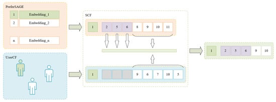 From the experimental results of various non-neural network-based collaborative filtering algorithms, we can see that the effectiveness of these algorithms is often weaker than that of neural network-based algorithms. Meanwhile, the hit items of neural network algorithms are usually concentrated in the head, and the density of hit items decreases as they rank lower. After the experiments, it was found that if the calculation results of neural network algorithms are directly combined with the results of collaborative filtering algorithms, the performance is not ideal in many cases, and it is also difficult to adjust parameters. If we can find a critical point in the middle place and make the results of the collaborative filtering algorithm work from here, we should be able to improve the model’s performance to a certain extent. The method used in this paper’s experiments is to manually adjust the position of this critical point after observing the results. After finding this critical point, the first n items of PreferSAGE are retained as the first n items of the prediction results. Then, the first items of the PreferSAGE prediction results are fused with the collaborative filtering results of user similarity using the weighted voting method, and the first items from the fusion result are selected and added to the prediction results to generate the final prediction result. A schematic diagram of the fusion process is shown in Figure 4.