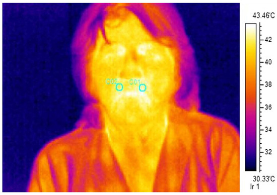 Infrared image of a patient exhibiting a lesion on his face, from Ref. [26]. Note that two symmetric regions were marked with blue circles. (permission asked and obtained from Elsevier, Amsterdam, The Netherlands).