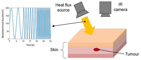 The feasibility of the frequency-modulated thermal wave imaging (FMTWI) technique used for the detection and distinction of skin cancer stages was theoretically proved for the first time by Bhowmik et al. [45] in 2005. The FMTWI technique foresees a controlled heating of the skin surface through a frequency-modulated heat flux of the desired magnitude and bandwidth, as shown in Figure 4. As a consequence, a highly diffused thermal wave propagates within the tissue, leading to time-varying temperature distributions. During the active heating, the temperature of the irradiated surface was recorded by an IR camera [45]. This method can be applied to thermally probe skin lesions at different depths using a single experimental test. Additionally, it requires a low peak power of the incident heat flux, and it is faster than other imaging techniques requiring periodically amplitude-modulated thermal excitation, such as LIT. The results showed that the FMTWI technique is suitable for the detection and differentiation of melanomas with large volumes rather than melanomas at the earliest development stages (with small volumes). Finally, by extracting the phase information from the simulated thermograms, the authors reported that the phase images have the advantage of allowing different development stages of melanoma to be clearly detected, compared to raw thermograms recorded by simply applying dynamic IR thermography.