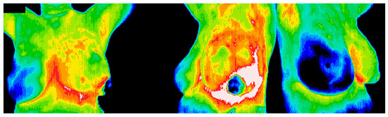 Low sensitivity values for digital infrared thermal imaging applied under steady-state conditions were reported by Kontos et al. [51] in 2011. These authors examined 63 patients using the Meditherm med2000 thermal imaging system. A series of the recorded thermal images is shown in Figure 5. The examination was performed in a room without windows, in which the temperature was approximately maintained at 22 °C. Also, the patients were left to acclimatize with ambient air for 10–15 min before sitting on a rotation stool (without a back rest) placed 1 m away from the thermographic camera. The authors concluded that steady-state infrared imaging should not be used as a screening test for breast cancer detection, and it was also not suitable for the primary evaluation of symptomatic patients because of its low sensitivity.