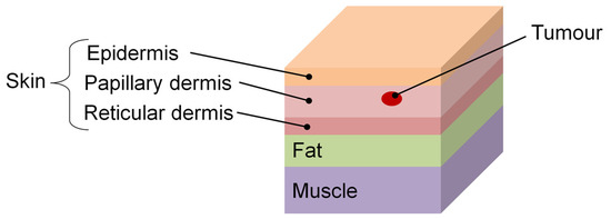 The most common modeling of the skin tissues used in the literature involves a five-layer structure consisting of the epidermis, papillary dermis, reticular dermis, fat layer, and muscle, as shown in Figure 7. One-dimensional (1D), two-dimensional (2D), or three-dimensional (3D) models based on the Pennes equation are encountered in the literature.