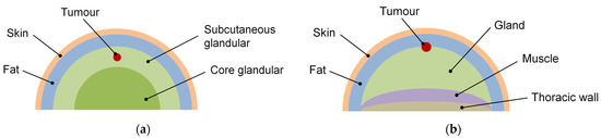 A numerical study to optimize the cooling stress applied for early detection of breast cancer from dynamic IR images was performed by Zhou and Herman [54]. Thermal contrasts observable when applying a cold stress for a duration of 15–25 min at a constant cooling temperature of 5–15 °C on the skin surface were analyzed using a 2D breast model by simulating tumors of different sizes, depths, and locations. The authors reported that to achieve the maximum thermal contrast for deeper and smaller tumors, the tissue should be cooled for 5–15 min; also, this maximum appears after 20–45 min during the thermal recovery phase [54]. Notwithstanding, the thermal signature of smaller tumors close to the muscle layer can be covered by the underlying layers at core body temperature, limiting the ability to detect lesions.
