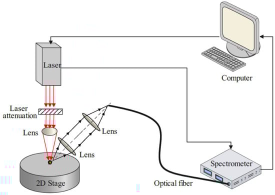 As shown in Figure 1, the LIBS experimental system consists of a Q-switched Nd:YAG laser, a spectrometer, a laser attenuator, optics, and a computer. The laser is a Q-switched Nd:YAG laser manufactured by Beamtech Optronics with an output wavelength of 1064 nm, a pulse width of 7 ns, a spot diameter of 7 mm, an energy of 300 mJ, and a frequency of 5 Hz. The laser passes through a laser attenuator, which reduces the energy from 300 mJ to 100 mJ, and then passes through a UV-fused silica plano-convex lens with a focal length of 75.3 mm UV-fused silica plano-convex lens with a focal length of 75.3 mm. In this way, the laser is focused on the surface of the sample, forming a coal plasma. The plasma signal was then transmitted to the spectrometer through two plano-convex lenses with a focal length of 40.1 mm each. Optimal experimental parameters were determined through parallel experimental tests, including a laser energy of 100 mJ, a Focus Depth of 2 mm (depth of focus buried in the sample), a delay time of 1.2 μs, and a sample pressure of 40 MPa. Under these parameters, the average relative standard deviation (RSD) of the main peak of the sample spectrum was kept within 15%. The LIBS system diagram is shown in Figure 1.