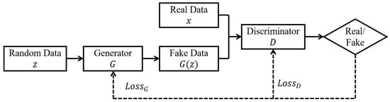 Generative Adversarial Network (GAN) is an unsupervised generative model, proposed by Goodfellow et al. [32] in 2014, whose basic structure includes a Generator and a Discriminator. The Generator generates pseudo-data as realistic as possible based on the distribution of sample data, while the Discriminator is used to discriminate whether the input data are real data or pseudo-data generated by the Generator. Through the game between the generator and the discriminator, GAN can reach a Nash equilibrium, so that the generated data can fit the data distribution of the real samples. The network structure of GAN is shown in Figure 2.