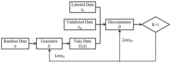 Odena [33] proposed a semi-supervised classification model in a GAN-based framework. The model is based on a GAN network in which the image samples generated by the GAN generator G are added to the database images. For a K-category classification problem, assuming that the newly generated categories are labeled as y = K + 1, the dimension of the output SoftMax classifier will be extended from K to K + 1 accordingly. By using a semi-supervised training method that combines supervised loss and loss function of unsupervised GAN network, a large amount of unlabeled sample data will be learned to assist a small amount of labeled sample data, so as to improve the accuracy of semi-supervised classification. The SGAN network structure is shown in Figure 3.