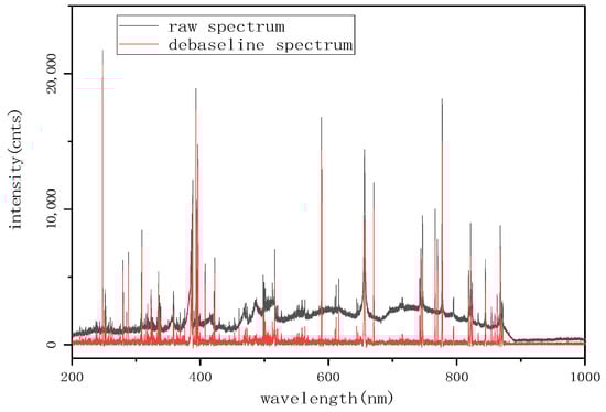 The baseline of the average spectrum is prone to drift, owing to the disturbance from the environment and equipment, which deteriorates the spectral accuracy and analysis results. Thus, baseline removal is indispensable for the improvement of the signal-to-noise ratio (SNR). It was indicated that the adaptive iterative reweighted penalty least squares algorithm (airPLS) [34] can better remove background noise. There was no user intervention and prior information, and it depended on the iterative weight change in the squared error between the fitted baseline and the original signal, which runs fast and flexibly. The effect of baseline removal is shown in Figure 4.