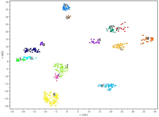 t-SNE calculation results. (A to O represent different types of coal samples).