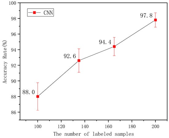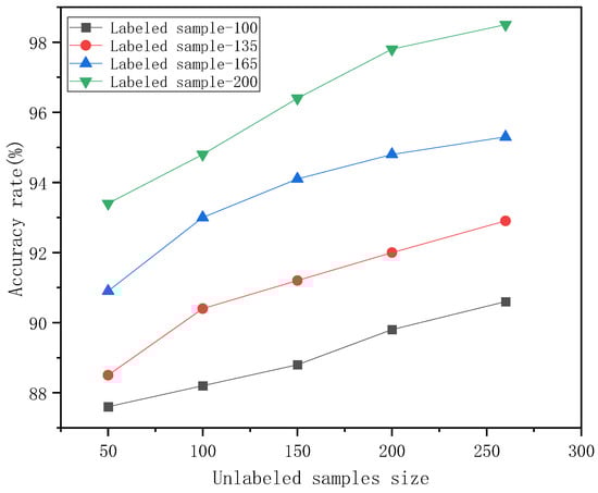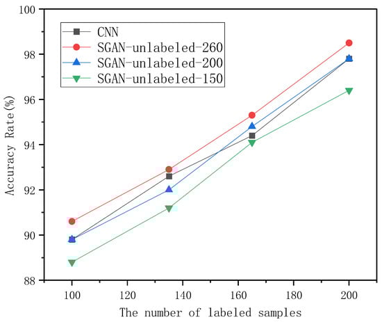 After verifying the effect of the number of unlabeled samples on model training, we investigated the effect of the number of labeled samples on model training in order to better evaluate the SGAN algorithm and more easily compare it with other models. In total, we conducted four experiments. The first labeled dataset contained 100 samples, the second labeled dataset contained 135 samples, the third labeled dataset contained 165 samples, and the fourth labeled dataset contained 200 samples. As shown in Figure 12, it can be seen that the number of labeled data has a great impact on the accuracy. When the number of unlabeled samples is 260, the classification accuracy increases from 90.6% when using 100 labeled samples to 98.5% when using 200 labeled samples, achieving a high classification accuracy.