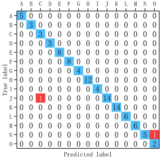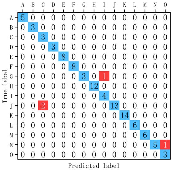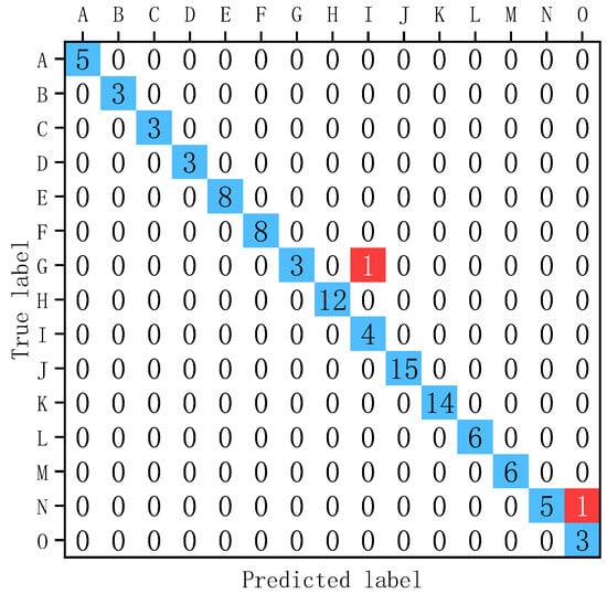 In the confusion matrix diagram, blue represents correctly classified samples and red represents incorrectly classified samples, which is the same rule in this paper. From Figure 8, it can be seen that the model misclassifies 1 sample in category J as category C and 1 sample in category N as category O. The model also misclassified 1 sample in class N as class O in the prediction set. After spectral comparison of the industrial analysis components of coal, it can be found that there is a certain intersection of the above misclassified categories, with a high degree of spectral similarity, and at the same time, it is verified that their industrial analysis data C are also similar.