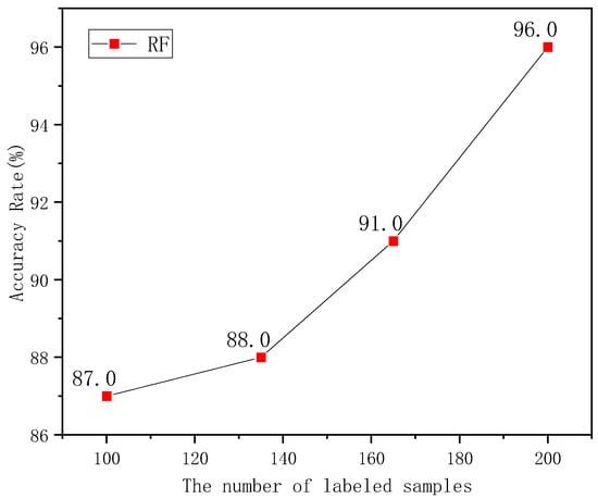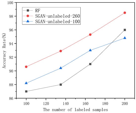 The RF model when the labeled dataset is 200 is compared with the SGAN model when the labeled dataset is 200, and the results are shown in Figure 15, which reveals that the classification accuracy of the SGAN model has a great advantage over the RF model when the number of unlabeled data reach 260, and the difference in classification accuracy between the SGAN model and the RF model is not great when the number of unlabeled data reach 100. However, the overall classification effect of the RF model is poor.