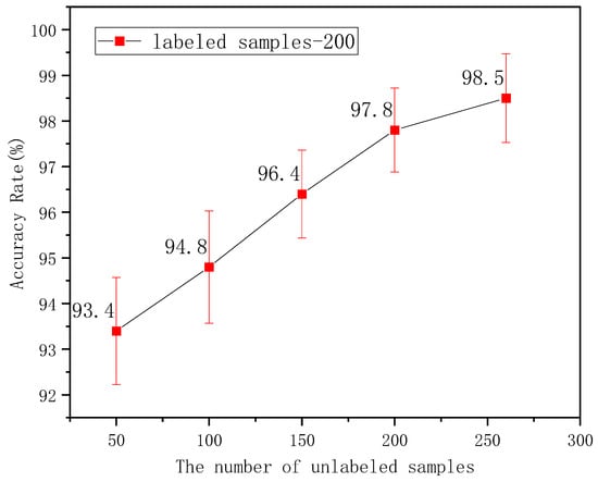 The unlabeled dataset in the first experiment contains 50 samples, the unlabeled dataset in the second experiment contains 100 samples, the unlabeled dataset in the third experiment contains 150 samples, the unlabeled dataset in the fourth experiment contains 200 samples, and the unlabeled dataset in the fifth experiment contains 260 samples. We evaluated the classification accuracy of the test set, and the results are as follows. As can be seen from Figure 11, the classification accuracy improves significantly as the number of unlabeled data increases, from 93.4% when there are only 50 unlabeled samples to 98.5% when there are 260 unlabeled samples. At the same time, it is not difficult to find that the improvement of the accuracy rate is gradually slowing down.