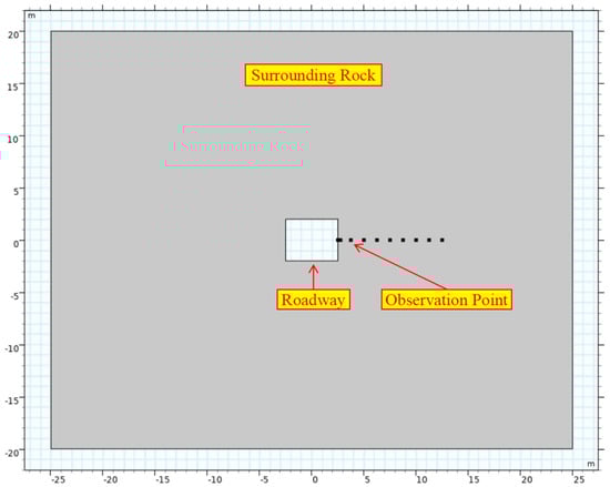 With the COMSOL 6.0 numerical simulation software, a two-dimensional numerical model of the surrounding rock of a high geothermal roadway is established to simulate the evolution of the surrounding rock temperature with time and space after 361 days of ventilation. As shown in Figure 1, the model features a 50 m width and a 40 m height. The roadway is rectangular and located in the center of the model, with a width of 5 m, a height of 4 m, and a hydraulic radius of 2.2 m. The density of the roadway-surrounding rock is set to 3000 kg/m3, with a specific heat capacity of 500 J/(kg·K).