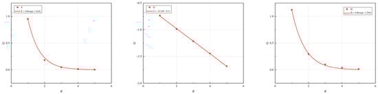 Plot the relationship curve between the dimensionless radius R and parameters E, G, and H based on the data in Table 2, as illustrated in Figure 2. It is evident that the dimensionless radius R exhibits an exponential function relationship with parameter E, a linear relationship with parameter G, and an exponential function relationship with parameter H.