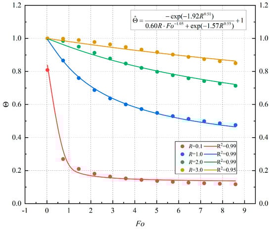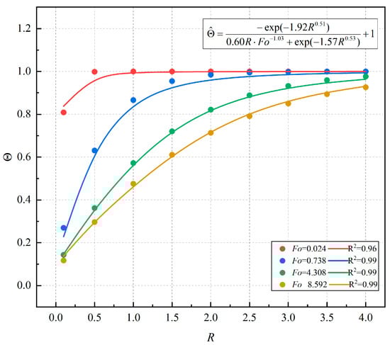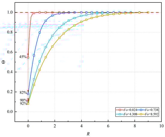 Figure 2 shows that the relationship between dimensionless temperature, dimensionless time (Fo), and dimensionless radius (R) is Θ = f(Fo, R). Therefore, Formulas (7) and (8) can be coupled, that is,