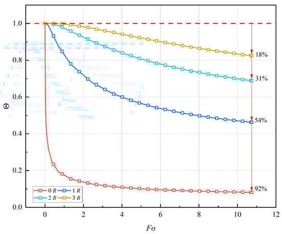 Figure 6 illustrates the time distribution curve of the dimensionless temperature of the roadway-surrounding rock under varying thermal conductivity. It is evident that, with the increase in dimensionless time under the same thermal conductivity, the dimensionless temperature gradually decreases, and the temperature drop rate also gradually decreases, ultimately reaching a constant value. Simultaneously, with an increase in thermal conductivity, the temperature drop rate of the surrounding rock gradually decreases, and the dimensionless temperature increases after stabilization. For example, considering R = 0, the dimensionless temperatures after stabilization are 0.04, 0.07, and 0.09. Compared with the VRT, the surrounding rock temperature decreased by 98%, 96.5%, and 95.5%, respectively. Additionally, the figure indicates that the influence of thermal conductivity on the temperature field of the surrounding rock gradually diminishes with an increase in dimensionless radius. As an illustration, considering Fo = 2, with an increase in thermal conductivity, the dimensionless temperatures corresponding to different dimensionless radii decrease as follows: R = 0: 95%, 90%, 83%; R = 1: 33%, 30%, 27%; R = 2: 11%, 10%, 9%; R = 3: 2%, 2%, 2%, respectively.