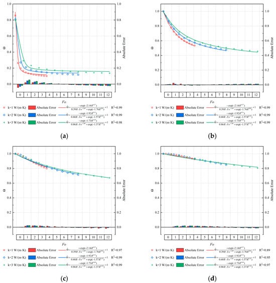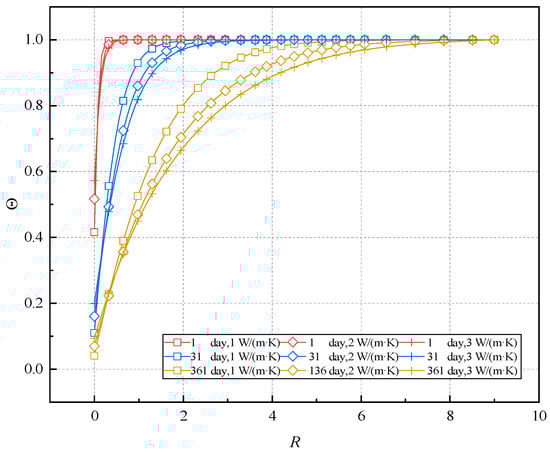 Additionally, the absolute error of the characteristic curve is observed to vary by ±0.1. Moreover, as the dimensionless radius increases, the absolute error of the characteristic curve gradually diminishes. For example, considering ventilation for 31 days with a thermal conductivity of 3 W/(m·K), as the dimensionless radius increases from R = 0.1 to R = 3, the absolute errors of the characteristic curves are 0.042, 0.001, 0.023, and 0.012, respectively. Moreover, with an increase in dimensionless time, the absolute error of the characteristic curve initially increases and then decreases, with the maximum absolute error primarily occurring during ventilation from 31 days to 91 days.