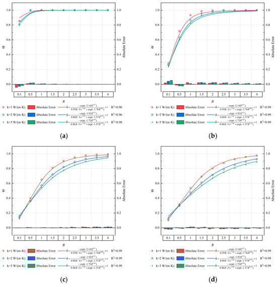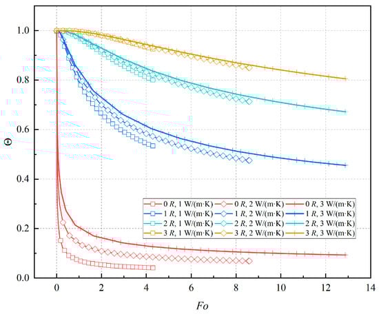Figure 10 illustrates the impact of thermal conductivity at different positions on the spatial–temporal coupling characteristics of the dimensionless temperature field of the roadway-surrounding rock. Owing to varying thermal conductivity, the corresponding Fo also differs at the same time. It is evident that the fitting degree of the characteristic curve gradually increases with the augmentation of thermal conductivity. For instance, at R = 3, with the augmentation of thermal conductivity, the fitting degree of the characteristic curve is 0.89, 0.95, and 0.97, respectively. But there are exceptions; for example, at R = 0.1, with the augmentation of thermal conductivity, the fitting degree of the characteristic curve is 0.99, 0.99, and 0.98, respectively.