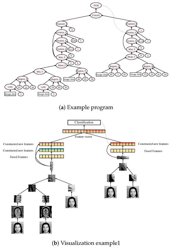 The terminal set includes original image data and parameters for image processing functions, with a detailed list provided in Table 7. Notably, the terminal m represents three different manual feature extraction methods. When the value of m is 0, the SIFT method is used for feature extraction, and the input image region is treated as a key point [37]. When the value of m is 1, the HOG method is employed to extract features, calculating the average of a 10 × 10 grid from the image area with a step size of 10 [7]. When the value of m is 2, the uniform LBP method is selected to extract histogram features, with a radius of 1.5 and a neighbor count of 8 [5].