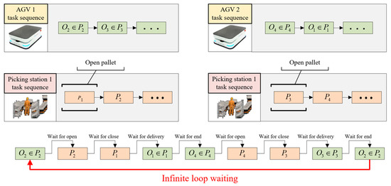 Interaction strategy of picking station, AGV: Waiting correction caused by capacity limit refers to the need for the AGV delivery to consider the capacity limit of the picking station. When an AGV arrives at the picking station, if the pallet containing this order is open or if the picking station capacity does not reach the upper limit, then the delivery is completed; if the order does not belong to any pallet being operated and the picking station capacity reaches the upper limit, then wait for the picking station capacity to be released. Due to the possibility of system deadlock caused by AGVs on standby waiting, standby waiting is modified to set up a temporary store buffer to wait for the capacity release in this paper, which is called buffer waiting. An example of a system deadlock is shown in Figure 6. When using the buffer waiting strategy, orders that need to wait are directly sent to the buffer, while the AGV continues to perform subsequent tasks. When the picking station capacity is released, the original AGV picks up the order from the buffer and sends the container to the picking station. Compared to standby waiting, the buffer waiting strategy increases the construction cost of the buffer and incurs additional energy consumption for AGV’s round-trip to and from the buffer. However, on the one hand, it can enable AGVs to quickly carry out subsequent order tasks, thereby improving overall efficiency. On the other hand, it converts standby waiting time into AGV’s round-trip time, which is equivalent to exchanging energy consumption for efficiency considering the first advantage. For the same solution as the MMATSP, these two strategies have similar comprehensive indicators of energy and efficiency, so using a buffer waiting strategy instead of a standby waiting strategy is reasonable. The last and most important is that the buffer waiting strategy ensures that each AGV scheduling scheme is a feasible solution. The pallet-picking process after adopting the MMATSP is shown in Figure 7.