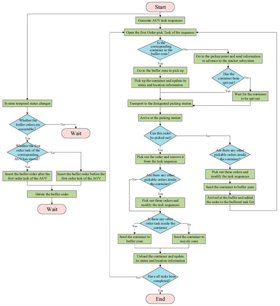 The main process of pallet picking is shown in Figure 2. Firstly, the pallet-picking tasks are assigned to each picking station, and the picking station will open several pallet-picking tasks based on its own capacity limit. After the tasks are opened, the upstream storage unit will “spit out” the containers to which the orders belong. The containers spit out are transported by AGVs to the picking stations to pick out. After all orders in the pallet are picked out, close the pallet-picking task, and open a new one until all pallet-picking tasks are completed.