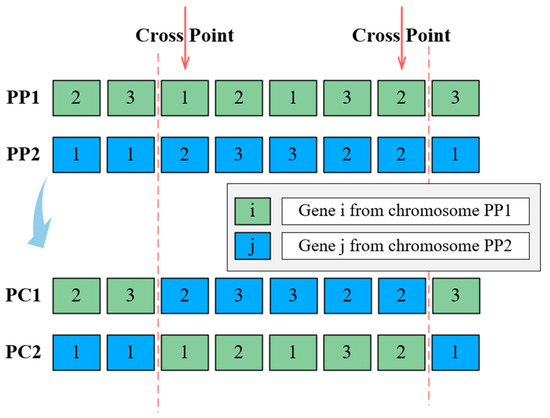 As shown in Equation (1), is a direct solution expressed jointly by two matrices and , where represents the number of available AGVs and represents the total number of order tasks. Corresponding to the intuitive expression of AGV task sequences, the order task sequences of AGVs are obtained by removing zero elements from row vectors extracted from matrices.