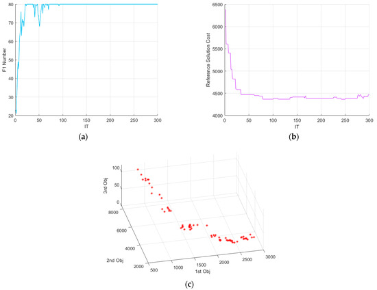 (a) Evolution curve of the number. (b) Evolution curve of the reference solution cost. (c) Pareto front distribution.