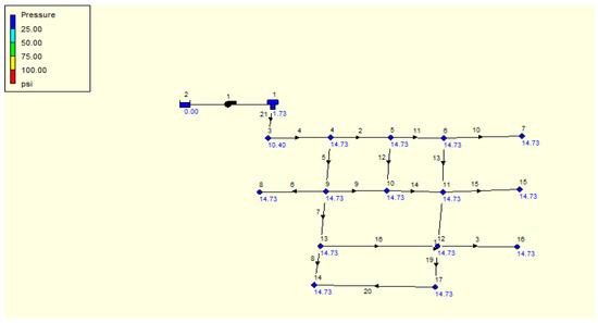 Choba Park at the University of Port Harcourt serves as the study location. The university comprises of three campuses, Choba Park, Abuja Park, and Delta Park, all within 1.2 km of one another, and each has its separate water supply system. Choba Park, on the other hand, has a 2500 m perimeter, 121 acres of land, four huge hostel blocks, engineering, educational, and agricultural scientific institutions, and business centers with banks, canteens, and photocopying facilities. Choba Park is a five-sided polygon because of the five coordinates that define its perimeter. It suffices to enter any one of the five locations, such as 40°53′44″ N, 60°54′24.65″ E, to access the study area’s map on Google. The existing water distribution network of Choba Park can be found in [32]. In contrast, the EPANET hydraulic model of the University of Port Harcourt Choba campus is shown in Figure 1.