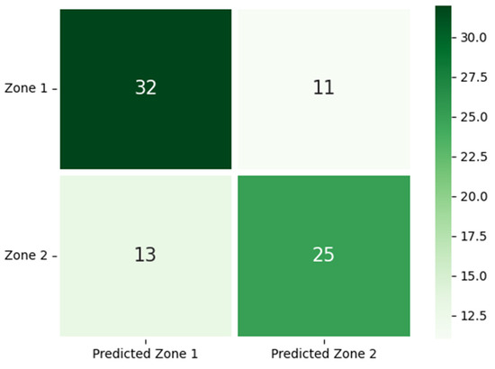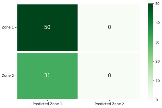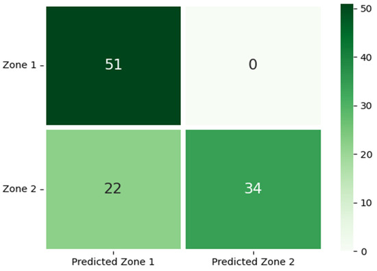 Additionally, Figure 6 shows the model’s performance in leak detection and localization across each zone. The figure indicates the model’s performance in zone 1 and zone 2. For zone 1, the recall, precision, and F1-score results were 1.0, 0.70, and 0.82, respectively. In zone 2, the recall, precision, and F1-score results were 1.0, 0.61, and 0.76.