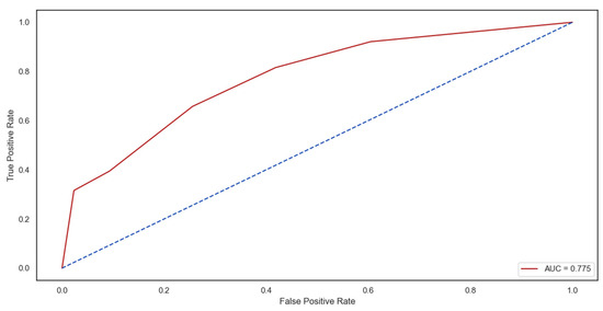 Additionally, Figure 2 shows the model’s performance in leak detection and localization across each zone. The figure indicates the model’s performance in zone 1 and zone 2. The zone, recall, precision, and F1-score results were 0.74, 0.71, and 0.73, respectively. At the same time, zone 2 recall, precision, and F1-score results were 0.66, 0.69, and 0.68. Furthermore, the receiver operating curve ROC (Figure 3) indicates that the model has an area under the curve AUC of 0.775, which indicates the model’s good performance in leak detection and localization using the simulated dataset.